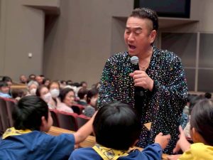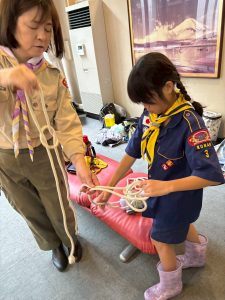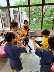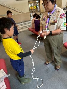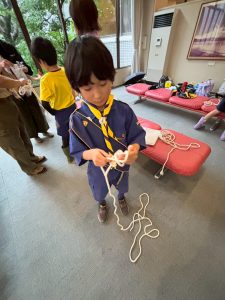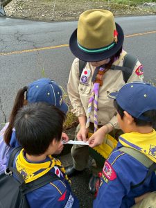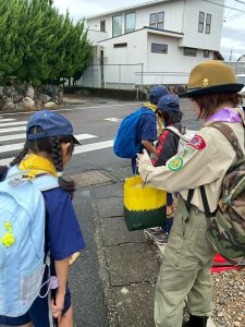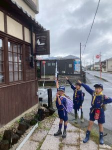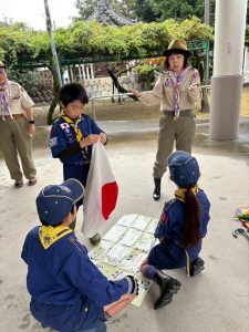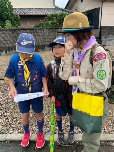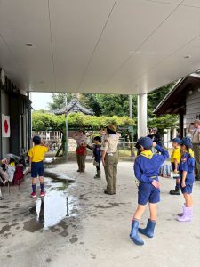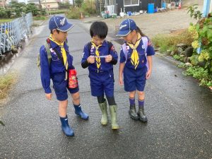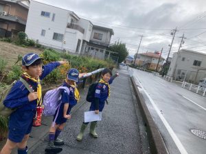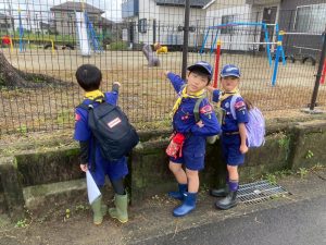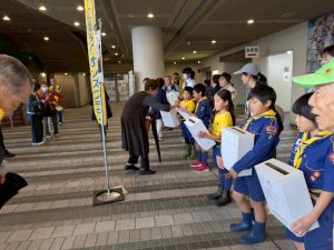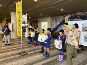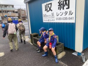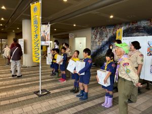午前中に雨の中ハイキングを行いました。午後は江南市民文化会館でライオンズクラブ小児がん募金活動を1時間ガールスカウトと一緒に行いました。カブたちは大声を出しすぎたため、疲れ切りグロッキー状態、事務局から頂いたお菓子とジュースでエネルギー補給ですぐに回復し、その後モノマネショーを観てきました。